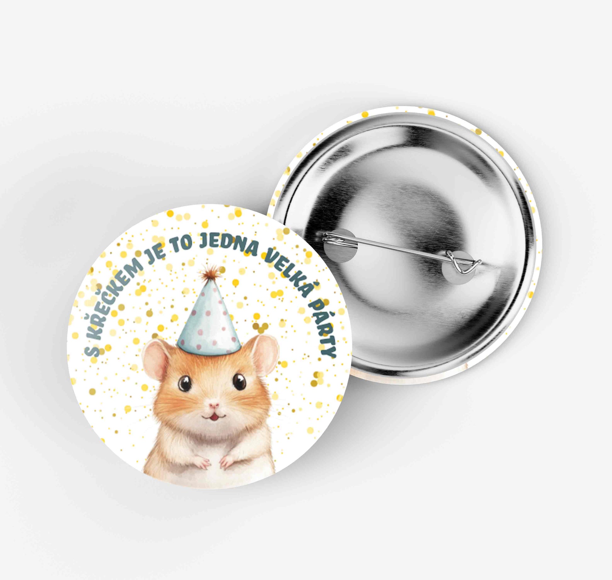 Placka: S křečkem je to jedna velká párty. Placka se špendlíkem, 32mm. Vhodný jako dárek.