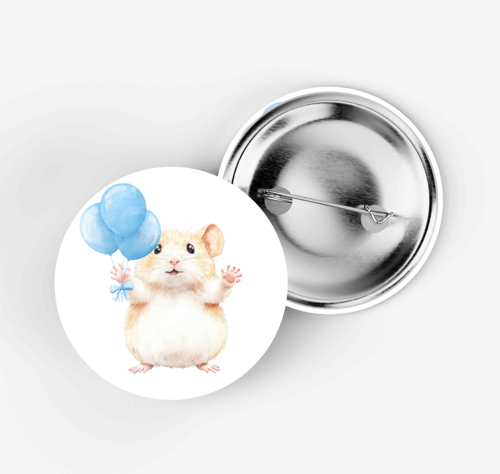 Placka s křečkem s balónky. Placka se špendlíkem, 32mm. Vhodný jako dárek.